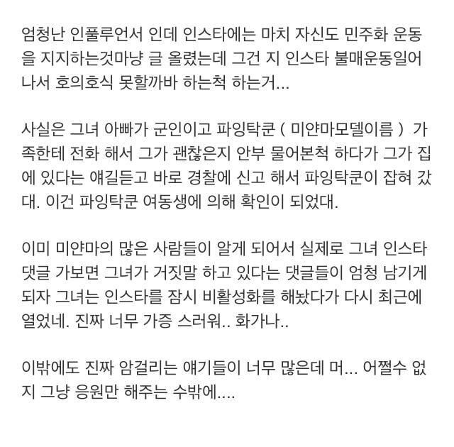 sns 계정에 민주화 운동 지지 게시물도 활발하게 올리고 시위에도 적극적으로 참여했는데