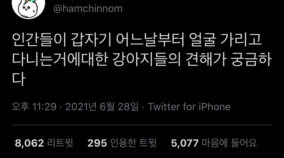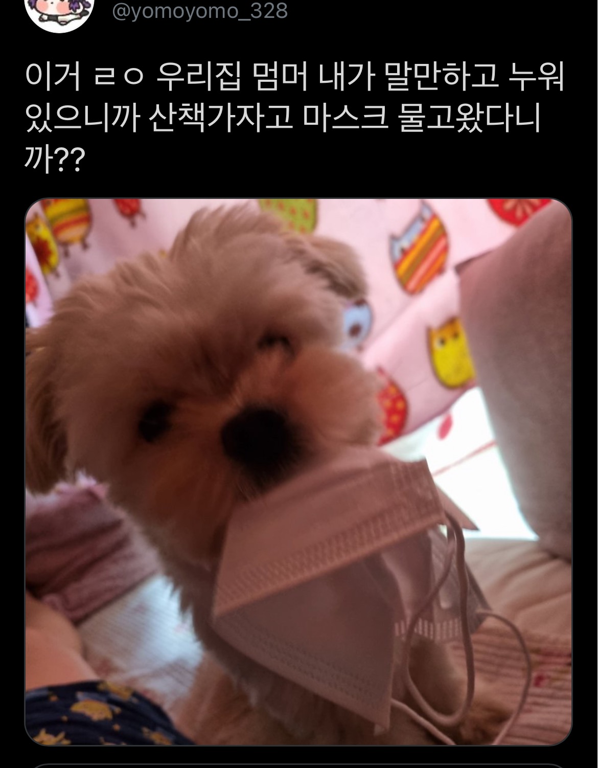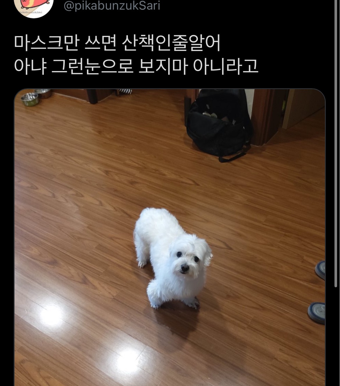 [흥미돋]코로나 시국 1년 7개월이면 강아지가.....twt 작성자아이엔지오|작성시간21.07.05|조회수16,101 목록 댓글 48 글자크기 작게가 글자크기 크게가 출처 : 여성시대 아이엔지오https://twitter.com/hamchinnom/status/1409519257847697410?s=20말키🛵 on Twitter“인간들이 갑자기 어느날부터 얼굴 가리고다니는거에대한 강아지들의 견해가 궁금하다”twitter.comhttps://twitter.com/pikabunzukSari/status/1410403199979229184?s=20사리🌸 on Twitter“마스크만 쓰면 산책인줄알어 아냐 그런눈으로 보지마 아니라고 https://t.co/otlCDJDrtl”twitter.comhttps://twitter.com/yomoyomo_328/status/1410503195999182850?s=20요모요모🔥 on Twitter“이거 ㄹㅇ 우리집 멈머 내가 말만하고 누워있으니까 산책가자고 마스크 물고왔다니까?? https://t.co/TZZDRhoaFK”twitter.com 다음검색 현재 게시글 추가 기능 열기 북마크 공유하기 신고 센터로 신고 댓글 댓글 48 댓글쓰기 답글쓰기 댓글 리스트 작성자이재윤 | 작성시간 21.07.05 울 강쥐도 마스크 끼는 순간 나 나가는줄 앎ㅋㅋㅋㅋㅋㅋㅋㅋㅋㅋㅋㅋ 작성자델론즈 | 작성시간 21.07.06 울강쥐돜ㅋㅋ 마스크끼면 나가는줄알음 ㅠ 작성자얄랴리까꿍 | 작성시간 21.07.06 아 진짜 천재같아 박사학위주자 응? 작성자내일도 살아 | 작성시간 21.07.06 우리 강아지도 마스크끼면 난리남 ㅋㅋㅋ 아니요 출근이라구요ㅠㅠ 작성자금연 | 작성시간 21.07.07 아 맞아 우리강쥐는 도망가서마스크끼면 나가는 줄 알고 도망가ㅠㅠ 댓글 전체보기