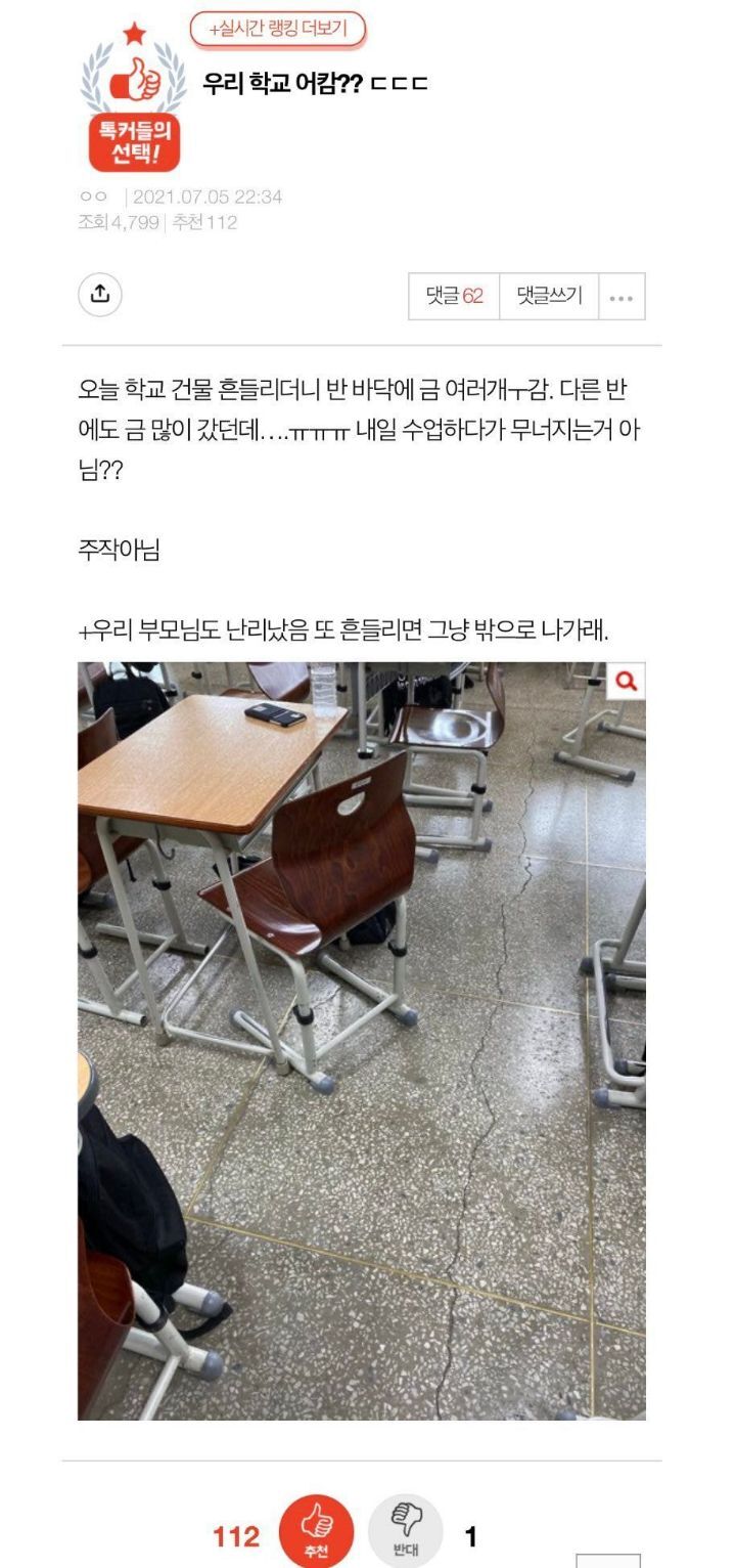 작성자뚜둣 작성시간 21.07.07 나 고딩때 딱 저 바닥에 금간 것도 있었는데 3년 잘 다녔고.... 졸업한지 n년됐는데 아직멀쩡한가벼,,,,, 저런 거 보고 진짜 아무 생각없었던게 신기하다