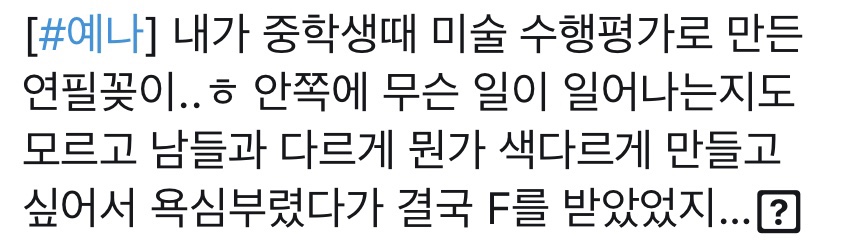 [흥미돋]미술 수행평가에서 F 받았던 최예나의 연필꽂이 작성자프로아가리다이어터|작성시간21.07.08|조회수24,138 목록 댓글 49 글자크기 작게가 글자크기 크게가 출처 : 여성시대 프로아가리다이어터 얼굴 만들겠다고 냅다 때려박아서 못질해버린 예나...이 짤 생각난다는 사람들도 있고트위터에서는 공계 비계 차이 같다고도 함ㅋㅋㅋ자매품돈먹는 하마 아니 코끼리 다음검색 현재 게시글 추가 기능 열기 북마크 공유하기 신고 센터로 신고 댓글 댓글 49 댓글쓰기 답글쓰기 댓글 리스트 작성자벅차오른 오덕 | 작성시간 21.07.09 존나귀여워ㅠㅠㅠㅠ 작성자비상대피도 | 작성시간 21.07.09 아 ㅈㄴ귀여웤ㅋㅋㅋㅋㅋㅋㅋㅋㅋㅋㅋㅋㅋ 작성자가장가까운바다 | 작성시간 21.07.09 편지 진짜 너무 귀여웤ㅋㅋㅋㅋㅋㅋ 작성자I love you to the moon and back | 작성시간 21.07.09 아졸라 파하항웃어버린 ㅠㅋㅋㅋㅋㅋㅋ개웃겨 작성자황해나 | 작성시간 21.07.09 아 ㅋㅋㅋㅋ ㅋㅋㅋㅋ 양말짤 찰떡 ㄱㅂ 댓글 전체보기