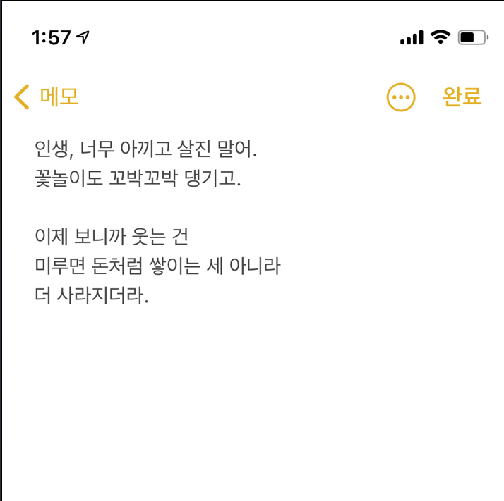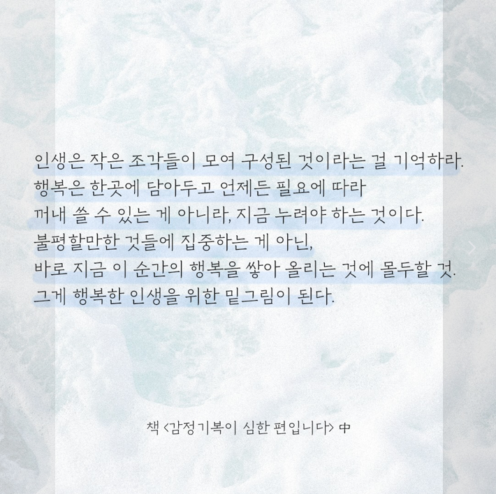 [흥미돋]92세 할머니의 인생 조언.jpg 작성자ㅇㄹㅇㄴㄱㄹㄷ|작성시간21.07.09|조회수7,030 목록 댓글 15 글자크기 작게가 글자크기 크게가 출처 : 여성시대 (ㅇㄹㅇㄴㄱㄹㄷ) 자신의 가능성을 믿어줄 것.하루씩 늙는 게 아닌 날마다 새로운 아침을 맞이할 것.변화하는 당신의 모습을 사랑할 것.지금 하고 있는 일을 사랑할 것.오늘 행복해야 한다는 사실을 잊지 말 것.마음속에 있는 꿈을 무시하지 말 것.<감정기복이 심한 편입니다만> 中- 띵언이라 가져왔어 여시들 다음검색 현재 게시글 추가 기능 열기 북마크 공유하기 신고 센터로 신고 댓글 댓글 15 댓글쓰기 답글쓰기 댓글 리스트 작성자좋려려려렬 | 작성시간 21.07.09 다 맞는말 좋다ㅎㅎ 작성자치명적인 매력의 소유자 | 작성시간 21.07.09 와 기운난다ㄹㅇ 작성자샤브샤브메롱 | 작성시간 21.07.09 멋지네 작성자식탐아제발재기해ㅠ | 작성시간 21.07.21 좋은말고마워!!! 작성자인생에 작은 늦음에 조급해하지 말자 | 작성시간 21.09.13 연어하다가 좋은글고마워~~ 댓글 전체보기
