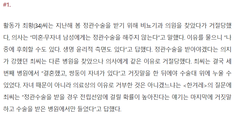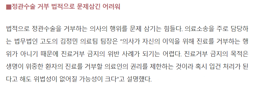 이상 비뇨기과 병원이 ‘미혼 무자녀 남성’ 정관수술 거부하는 이유로 비추어 내가 산부인과에서 의료적 이유도 아니고 남자 꼬추 질에 안 넣어봤다는 이유로 미레나 시술을 거부당해도 왜 소송에서 승소할 수 없는지에 대해 알아보았다. (지가 여호와의 증인이라고 환자한테 수혈 안 하는 의사랑 다를 바가 뭐임)