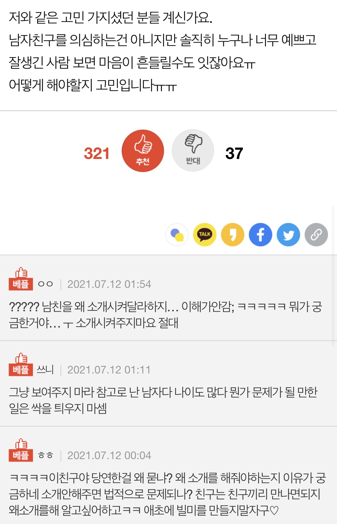 작성자안대용가리 작성시간 21.07.13 예쁜친구 한번 보여줬다고 마음 흔들리거나 바람필 남자면 밖에서 어떻게 행동하고다닐지 뻔함 ㅎㅎㅎ 결혼전 검증으로 한번보여주는게 더나을지도