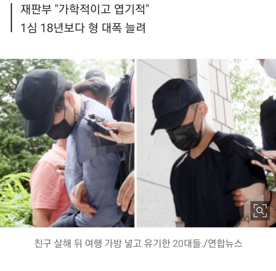 마약을 흡입한 채 친구를 장시간 때려 살해한 뒤 시신을 가방에 유기한 혐의로 기소된 20대 두 명이 항소심에서 형이 대폭 늘었다.