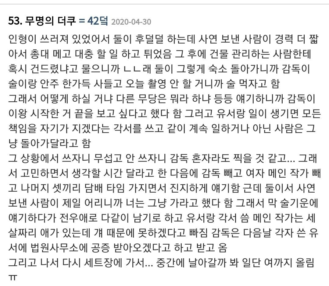 감독님은 이미 사비를 털었고 오랫동안 같이 일해온 사람이니까 믿고 끝까지 촬영해보기로 함