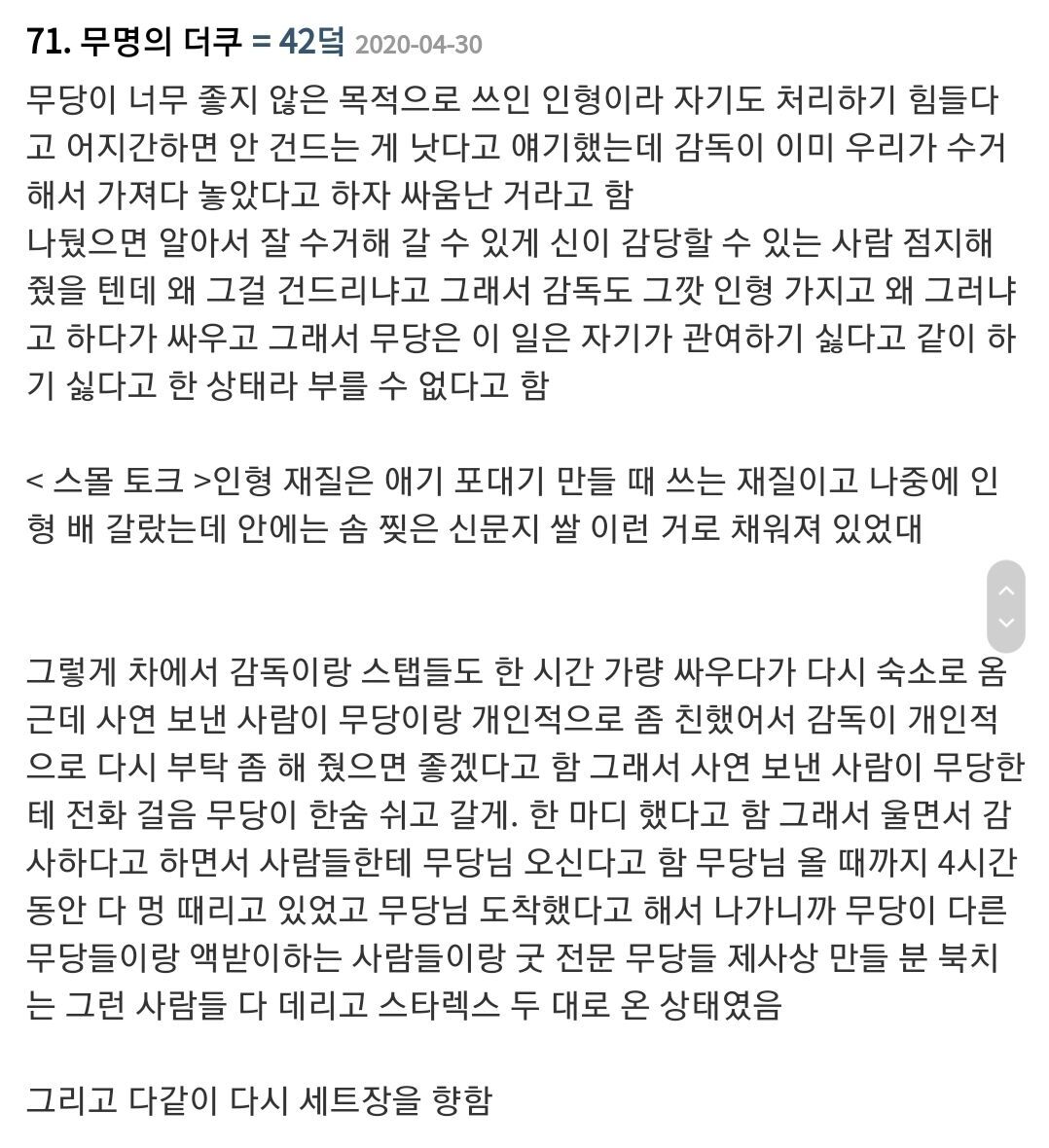 그 무당이 감독 설명 듣고 이건 정말 위험한 거니까 하지 말라면서 감독이랑 엄청 싸웠음