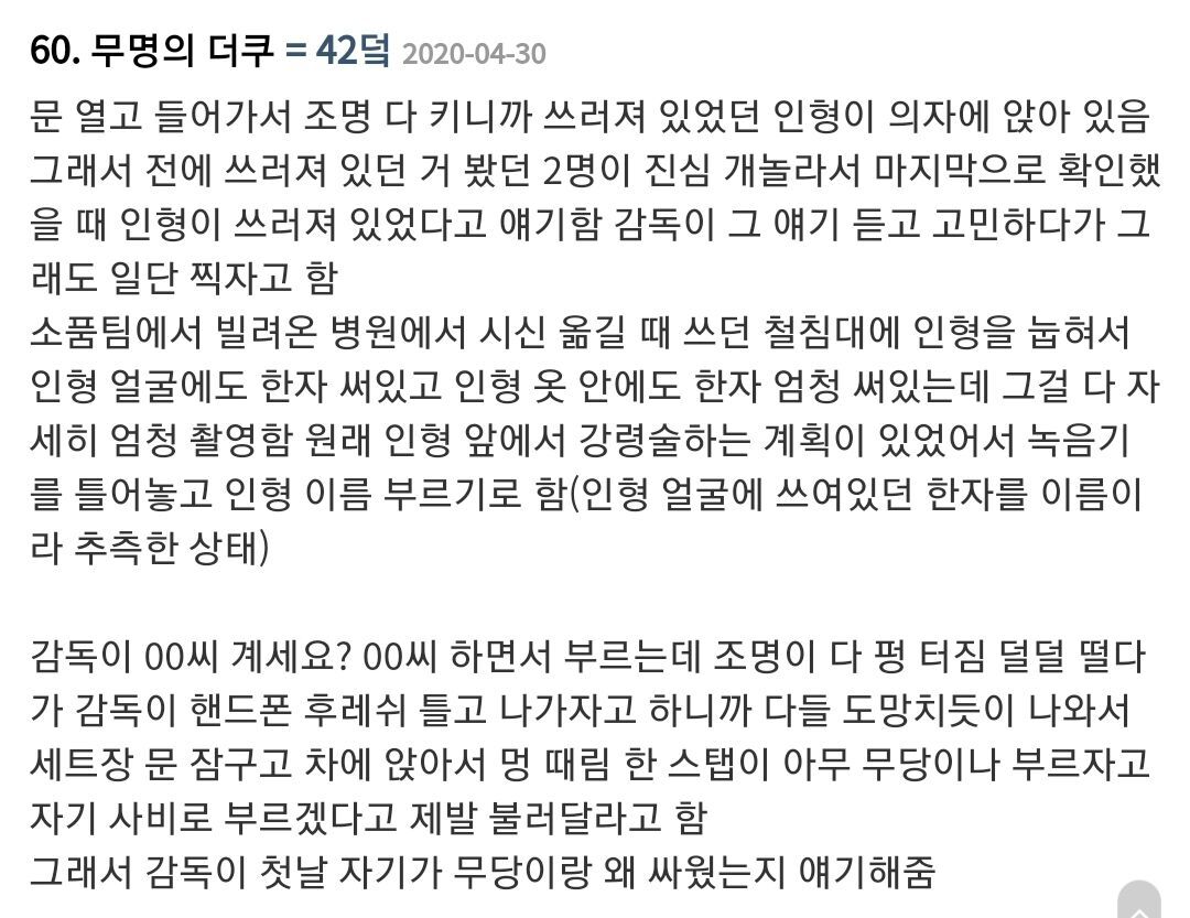 나중에는 담력 쎈 고인물들만 남는데 그런 고인물중 고인물이었던 이 관계자조차도 저주인형 촬영때문에 일 그만둘까 심각하게 고민했었다함