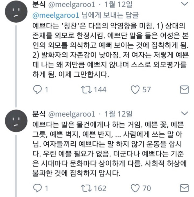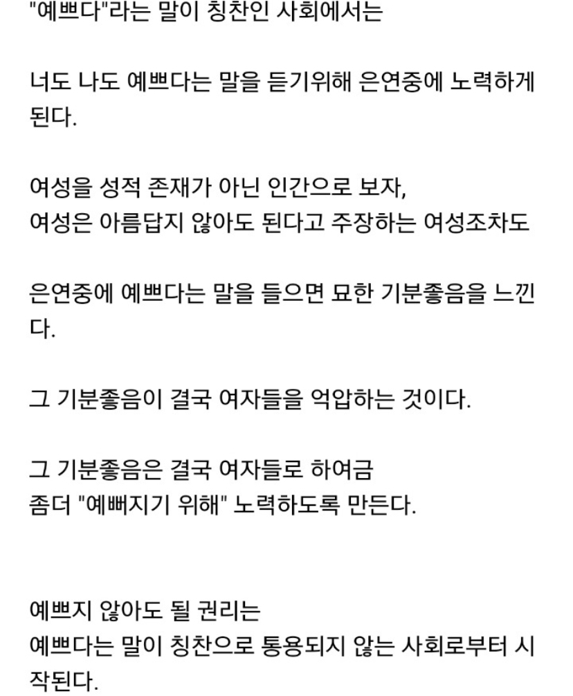 작성자사랑자그마한별 작성시간 21.07.19 예쁘다는건 물건한테나 하는 말이라는거 공감.. 사람한테 외적으로 어쩌고저쩌고 안했으면