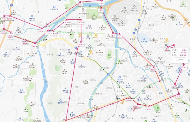 대전역-성심당-엑스포광장-한밭수목원-엑스포다리-엑스포-카이스트-충남대-월드컵경기장-유성온천-정부청사-갤러리아-배재대-서대전네거리-한밭구장-하늘공원-우송대-대전복합터미널