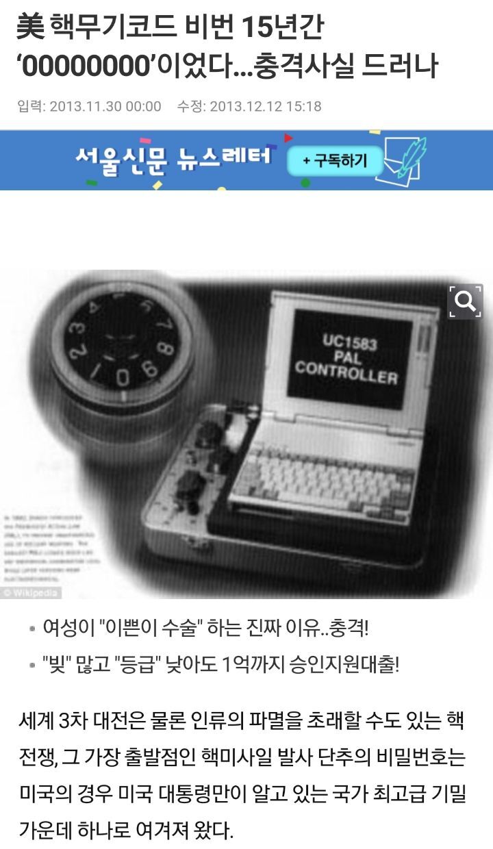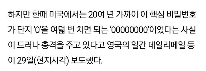 [여시뉴스데스크]美 핵무기코드 비번 15년간 ‘00000000’이었다…충격사실 드러나 작성자레오밤밤|작성시간21.07.28|조회수7,907 목록 댓글 21 글자크기 작게가 글자크기 크게가 출처 : https://m.nownews.seoul.co.kr/news/newsView.php?cp=nownews&id=20131130601009美 핵무기코드 비번 15년간 ‘00000000’이었다…충격사실 드러나, 세계 3차 대전은 물론 인류의 파멸을 초래할 수도 있는 핵전쟁, 그 가장 출발점인 핵미사일 발사 단추의 비밀번호는 미국의 경우 미국 대통령만이 알고 있는 국가 최고급 기밀 가운데 하나로 m.nownews.seoul.co.kr미국 대통령만이 알고 있는 국가 최고급 기밀인데비번 00000000 ㅋㅋㅋ 다음검색 현재 게시글 추가 기능 열기 북마크 공유하기 신고 센터로 신고 댓글 댓글 21 댓글쓰기 답글쓰기 댓글 리스트 작성자다먹었어?그럼이제밥볶아먹자 | 작성시간 21.07.29 성의없네? 숫자랑 특수문자 넣으라고! 작성자뚜루릐 | 작성시간 21.07.29 아니...... 작성자ㅈㅋㄱㄹㅅ | 작성시간 21.07.29 바꾸는법 모르는거 아냐? 작성자유리심장 | 작성시간 21.07.29 국룰아니라 세계룰이었나봄 작성자우리집으로 | 작성시간 21.07.29 와이파이비번보다못하노 ㅠ 댓글 전체보기