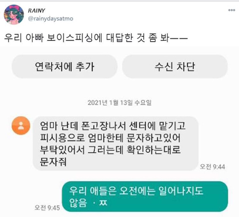 [스크랩] [배꼽의행방]아빠가 사기문자를 알아본 이유 작성자응 아가리|작성시간21.07.31|조회수10,848 목록 댓글 9 글자크기 작게가 글자크기 크게가 출처 : 여성시대 응 아가리미방 춘식 우리아빠: 일리있네 다음검색 스크랩 원문 : *여성시대* 차분한 20대들의 알흠다운 공간 현재 게시글 추가 기능 열기 북마크 공유하기 신고 센터로 신고 댓글 댓글 9 댓글쓰기 답글쓰기 댓글 리스트 작성자말하기전 생각했나요? | 작성시간 21.07.31 쯔! 작성자너 뭐하는?.. | 작성시간 21.07.31 ㅋㅋㅋㅋㅋ 작성자롤라이자이스이콘 | 작성시간 21.07.31 ㅋㅋㅋㅋㅋㅋ 우리아빠도 우리 딸이 나한테 연락할 애가 아닌데 싶어서 엄마가 전화왔더라 작성자부추쫑 | 작성시간 21.07.31 • ㅉ 작성자꼬치마우스렁롱렁 | 작성시간 21.08.01 우리애들은 아빠라고 부르지도 않음 ㅉ 댓글 전체보기