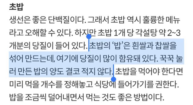 [스크랩] [흥미돋]당뇨 환자가 피해야 할 대표 메뉴 ‘초밥’ 작성자우리집개김코코코|작성시간21.08.05|조회수36,320 목록 댓글 25 글자크기 작게가 글자크기 크게가 출처 : https://jhealthmediam.joins.com/article/article_view.asp?pno=19413흰쌀밥은 혈당지수가 높음게다가 단촛물은 설탕+식초 다음검색 스크랩 원문 : *여성시대* 차분한 20대들의 알흠다운 공간 현재 게시글 추가 기능 열기 북마크 공유하기 신고 센터로 신고 댓글 댓글 25 댓글쓰기 답글쓰기 댓글 리스트 작성자초사이언 | 작성시간 21.08.05 금방 시켰는데... 작성자빅파이포도맛 | 작성시간 21.08.05 먹으면서 딱 봤네..ㅠ 이미지 확대 작성자ㅌㄹㄷ | 작성시간 21.08.05 모르는일이야 작성자베이비돌좋아 | 작성시간 21.08.05 그 뭐냐 당뇨 환자한텐 걍 흰쌀밥 자체가 안좋지?ㅠㅠ모두들 건강하시길 작성자멋진토마토 | 작성시간 21.08.06 ㅠㅠ 맞아,,,, 나도 먹으면서 불안해 ㅋㅋㅋ 댓글 전체보기