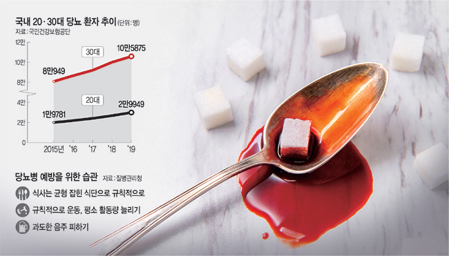 20·30대 당뇨병 환자의 증가세는 통계로 뚜렷이 확인된다. 국민건강보험공단에 따르면 20·30대 당뇨병 환자는 2019년 기준 13만5824명으로 2015년보다 34.8%가량 늘었다. 20대 환자는 2015년 1만9781명에서 매년 늘어 2019년에는 2만9949명에 달했다. 30대 환자는 같은 기간 8만949명에서 10만5875명으로 늘었다. 이 기간 전체 당뇨병 환자가 27.7% 증가한 것과 비교해도 더 높은 증가세를 나타낸 셈이다. 전문가들은 급격히 서구화된 식습관이 우리나라 사람들의 특성과 부조화를 일으킨다고 본다. 한국인은 기본적으로 인슐린을 분비해 당을 조절하는 역할을 하는 췌장이 서양인에 비해 작고 기능도 떨어진다. 달고 기름진 음식 위주의 섭취는 늘어났지만, 신체가 이러한 섭취를 따라가지 못한다는 것이다.