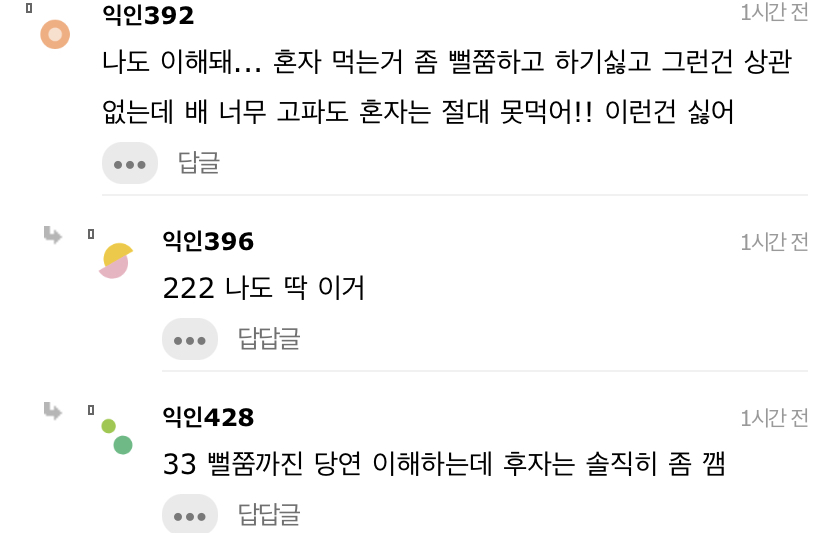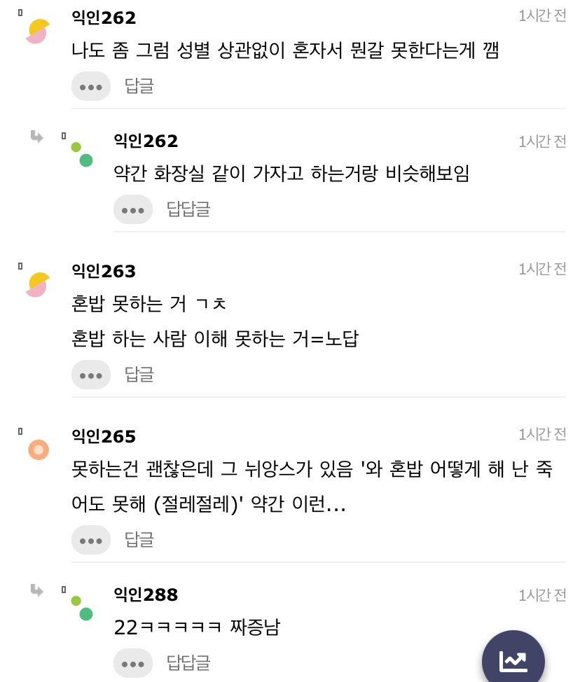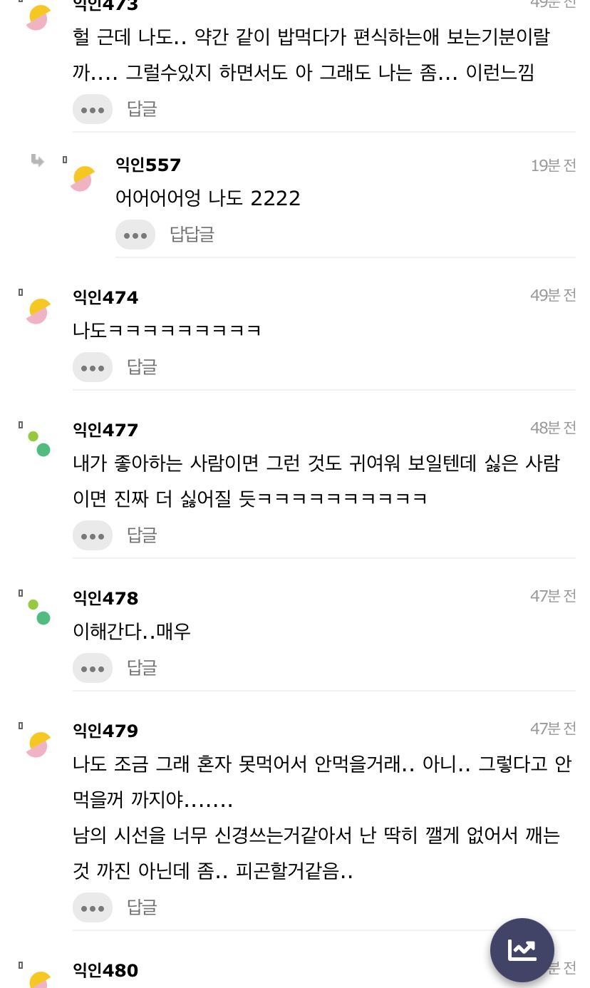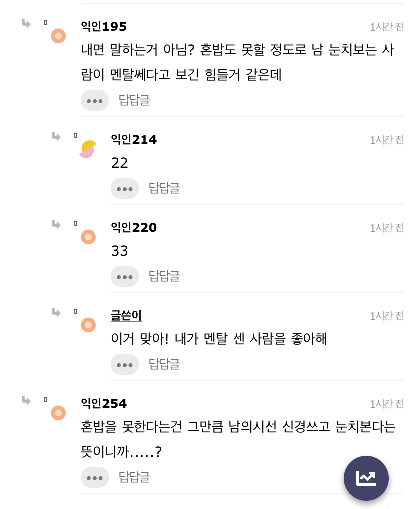 답댓글 작성자한미주식장인 작성시간 21.08.14 22222나도 의존적인사람 별로 안좋아해서 그냥 그게 머라고 밥까지 굶지?? 뭐때문이지?? 이런느낌 혼밥부끄럽다 이거까진 이해되는데 막 혼밥절대못해 이런거는 좀 다큰 성인이 애기도 아니고 넘 먼가 유약한 성향같아서 별루