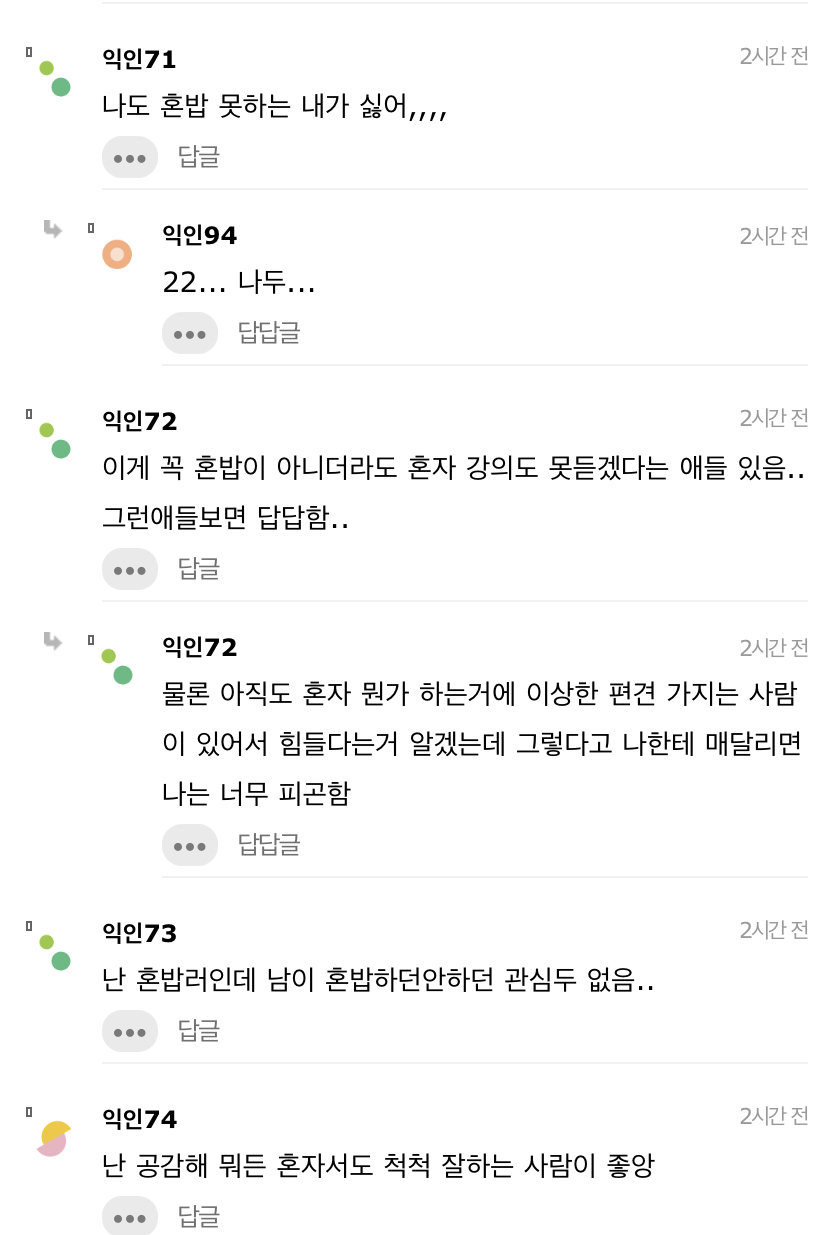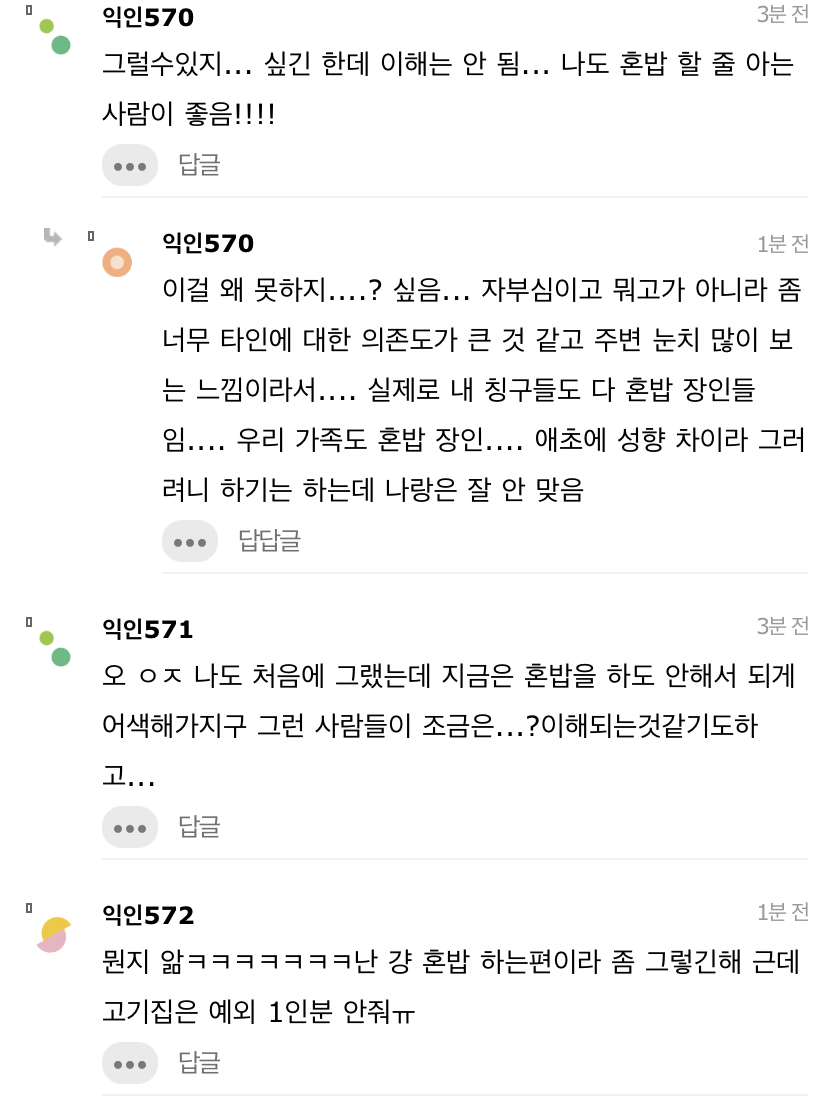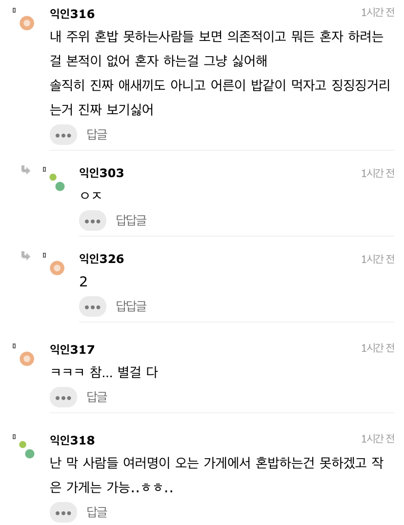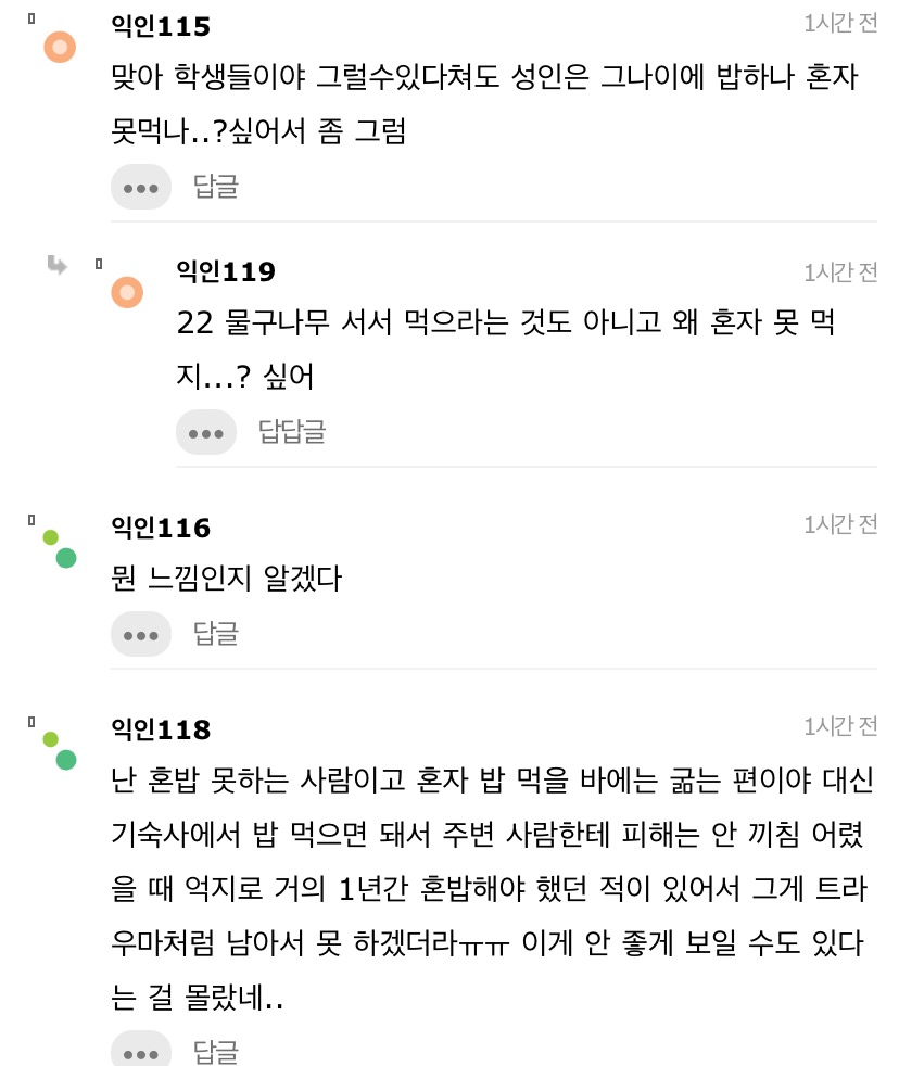 답댓글 작성자한미주식장인 작성시간 21.08.14 22222나도 의존적인사람 별로 안좋아해서 그냥 그게 머라고 밥까지 굶지?? 뭐때문이지?? 이런느낌 혼밥부끄럽다 이거까진 이해되는데 막 혼밥절대못해 이런거는 좀 다큰 성인이 애기도 아니고 넘 먼가 유약한 성향같아서 별루