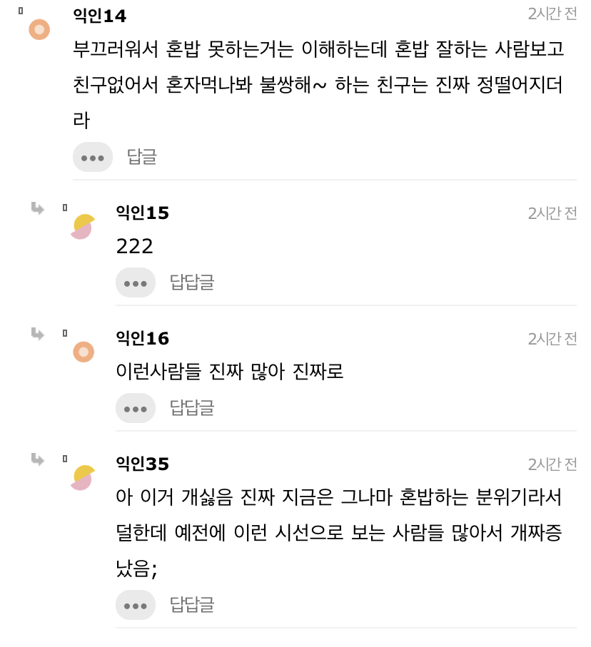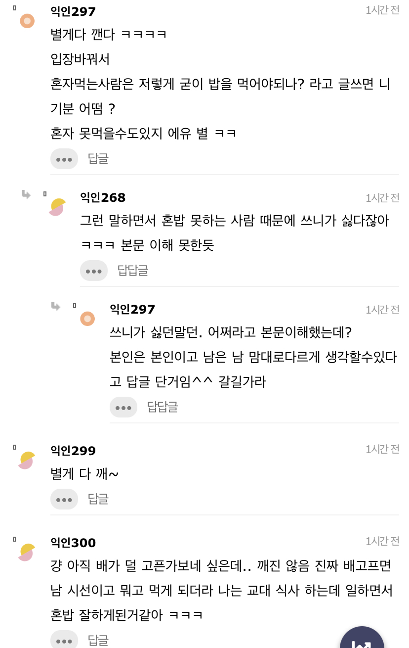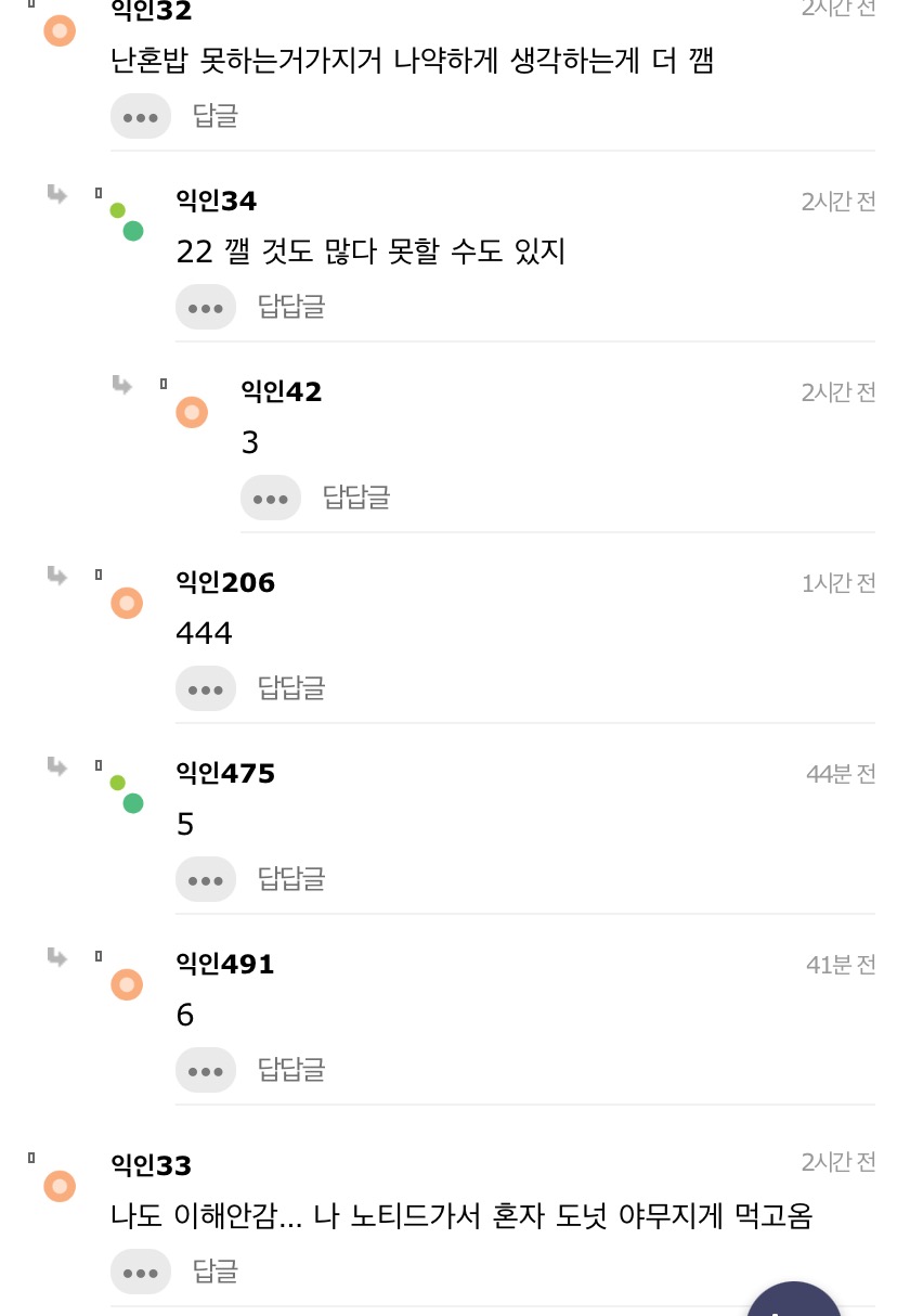 작성자짜가눈 작성시간 21.08.14 ㅇㅈㅋㅋㅋㅋ 시밬ㅋㅋ 밥 걍 혼자 쳐먹는거를 왜 못 먹겠다는건지.. 근데 밥 같이 먹어야 맛있긴 함