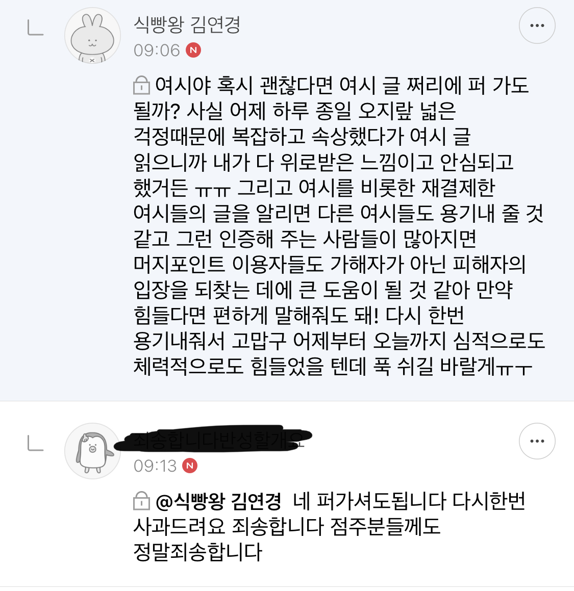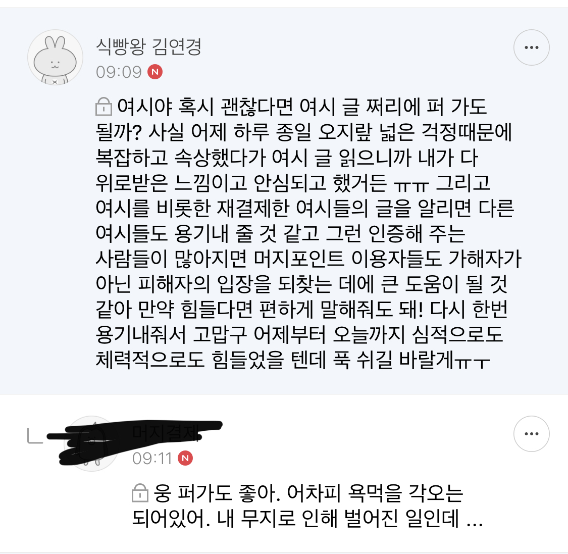 작성자소추히스테리 작성시간 21.08.17 솔직히 익명이라 모르는 척 하면 모르는 척 할 수도 있었을 텐데 멋있다 여시야 그리고 고마워!