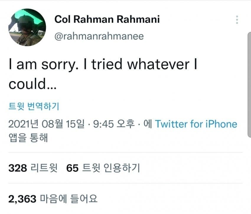 [스크랩] [흥미돋]아프가니스탄 헬기 조종사의 마지막 트위터.jpg 작성자우아아므드|작성시간21.08.16|조회수20,676 목록 댓글 21 글자크기 작게가 글자크기 크게가 다음검색 스크랩 원문 : 이종격투기 현재 게시글 추가 기능 열기 북마크 공유하기 신고 센터로 신고 댓글 댓글 21 댓글쓰기 답글쓰기 댓글 리스트 작성자역류성 식도염 | 작성시간 21.08.16 하... 삭제된 댓글입니다. 답댓글 작성자흐그흐규 | 작성시간 21.08.16 내말이. 지들 소원대로 디졌을텐데 원통해 답댓글 작성자흐그흐규 | 작성시간 21.08.16 2021 복권당첨 ㅋㅋㅋㅋㅋㅋ아오 빡쳐 작성자bravenewworld | 작성시간 21.08.16 시발 이게무슨일이람 21세기에 댓글 전체보기
