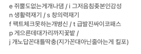 [스크랩] [배꼽의행방]개극단적인 mbti 팩폭ㅋㅋㅋㅋㅋㅋ 작성자넵넵충입니다|작성시간21.08.16|조회수20,207 목록 댓글 93 글자크기 작게가 글자크기 크게가 출처 : 여성시대 정상이랜다ㅎmbti 과몰입러인 인프피친구가쓴건데 ㅈㄴ웃겨서 올림 + 내가 약간 수정솔직히 인정씨발;ㅜㅋㅋㄱㅋㅋㅋㅋㅋㄱㅋㅋㅋㅋㅋㅋㅋㅋㅋㅋㅋㅋㅋㅋㅋㅋ 다음검색 스크랩 원문 : *여성시대* 차분한 20대들의 알흠다운 공간 현재 게시글 추가 기능 열기 북마크 공유하기 신고 센터로 신고 댓글 댓글 93 댓글쓰기 답글쓰기 댓글 리스트 작성자먘먘몈 | 작성시간 21.08.17 존나웃기다 ㅋㅋㅋㅋㅋㅋㅋㅋㅋㅋ 작성자해쭈처돌이 | 작성시간 21.08.17 헐 작성자룰룰룰릴릴릴 | 작성시간 21.08.17 하나하나 개맞말 작성자안산 안산 안삼 | 작성시간 21.08.17 와씨 개맞말이닼ㅋㅋㅋㅋㅋㅋㅋㅋㅋ 작성자보여줄게완전히똑같은나 | 작성시간 21.08.17 쥐뿔도없는게 개나대고 생활력 재기한 급발진 사이코패스에 게으른데 대가리까지 꽃밭인사람 됐노....... 댓글 전체보기