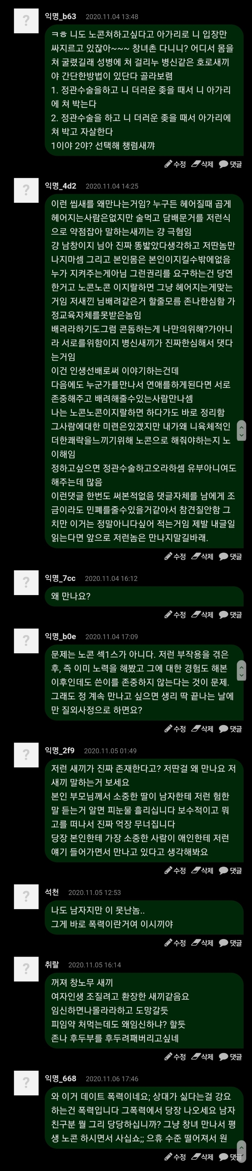 작성자아무로 작성시간 21.08.17 노콘하고 싶으면 지 좆을 먼저 자르라고 해 ㅅㅂ