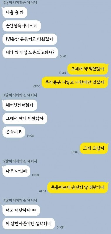 아무튼 피임약을 먹는 동안 저희는 관계를 하지않았습니다. 제가 남자친구에게 헤어지자고 했기 때문이죠. 사소한 걸로 다퉜는데 제가 홧김에 헤어지자고 했어요. 그러고는 저희가 또 다시 만나게되었습니다. 그리곤 또 노콘 문제로 싸웠죠. 남자친구는 제가 홧김에 헤어지자해서 노콘관계를 못했으니 노콘을 하고싶다 했습니다. 여자친구가 피임약부작용때문에 고생한걸 알고도 노콘을 요구하는게, 저는 이해가 안되고 억울합니다.