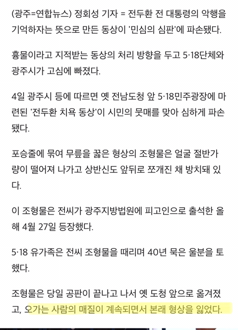 작성자햄찌에겐 포기란 없지 작성시간 21.08.22 곧 전두환 뒤질꺼 같던데 그 묘앞에 둬야지 뭐, 훌륭한작품인걸
