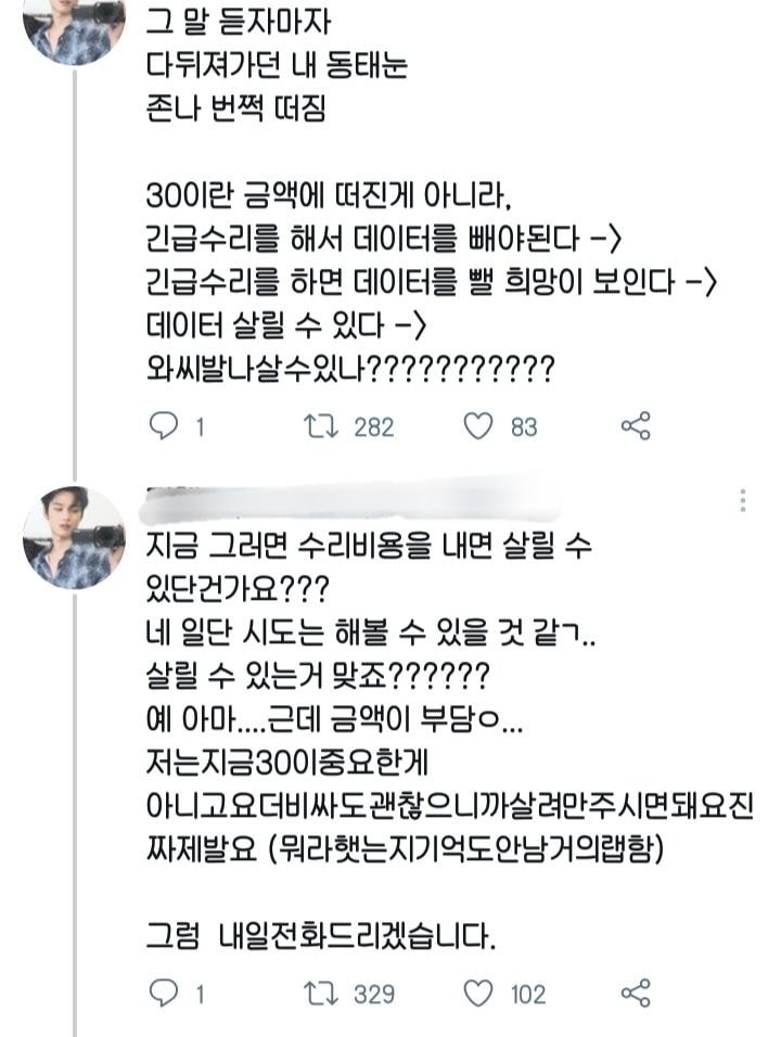 작성자불로소득으로놀고먹게해주세요 작성시간 21.08.22 나도 잡스에서 수리했는데 진짜 친절하게 설명해주시고 생각보다 빨리 수리해주시고… 아무튼 최고엿음 ㅠㅠ 첨엔 못살릴수더 잇다고 그래서 진짜 망연자실했는데 해봐야죠 뭐~ 이러시더니 뚝딱 고쳐주심!!!! 가본적있어서 더상상가네 ㅋㅋㅋㅋㅋㅋㅋㅋ