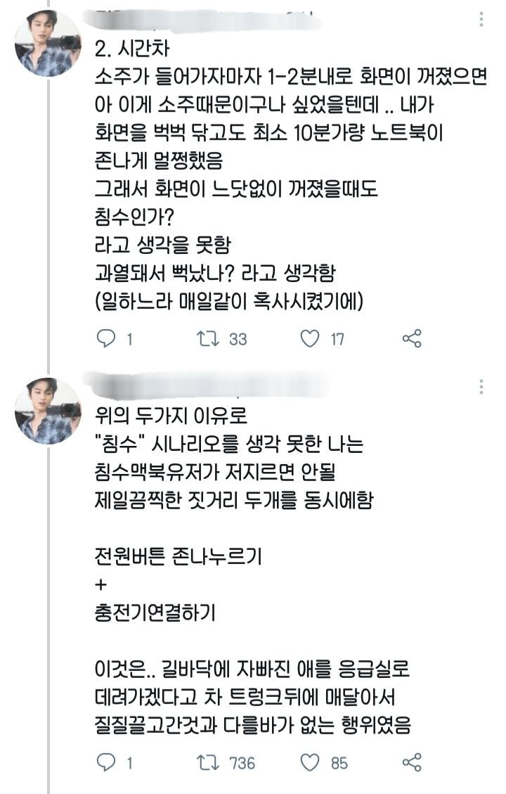 작성자stockholm 작성시간 21.08.22 와 나도 침수됐을 때 아무것도 몰라서 그냥 전원 켰다가 타는 냄새 났다가 식겁해서 공식에 맡겼는데 100만원 나올 수도 있대서(차라리 새로 사라고 함ㅠㅠ산지 1년 됐는데요ㅠㅠ) 수리 맡긴 3일 동안 매일 눈물의 기도함.... 다행히도 수리비 5만원 나옴.........그날 이후로 한 번도 고장 안나고 10년 째 잘 쓰고있음