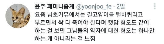 작성자망고스틴쩝쩝 작성시간 21.08.24 어제 20초 남자애가 길냥이(엄청 애교 많음ㅠ 나한테도 박치기하고 다시 돌아감) 놀아주고 있었는데 괜히 불안하더라고 요새 고양이 혐오가 심해서 ㅠㅠ