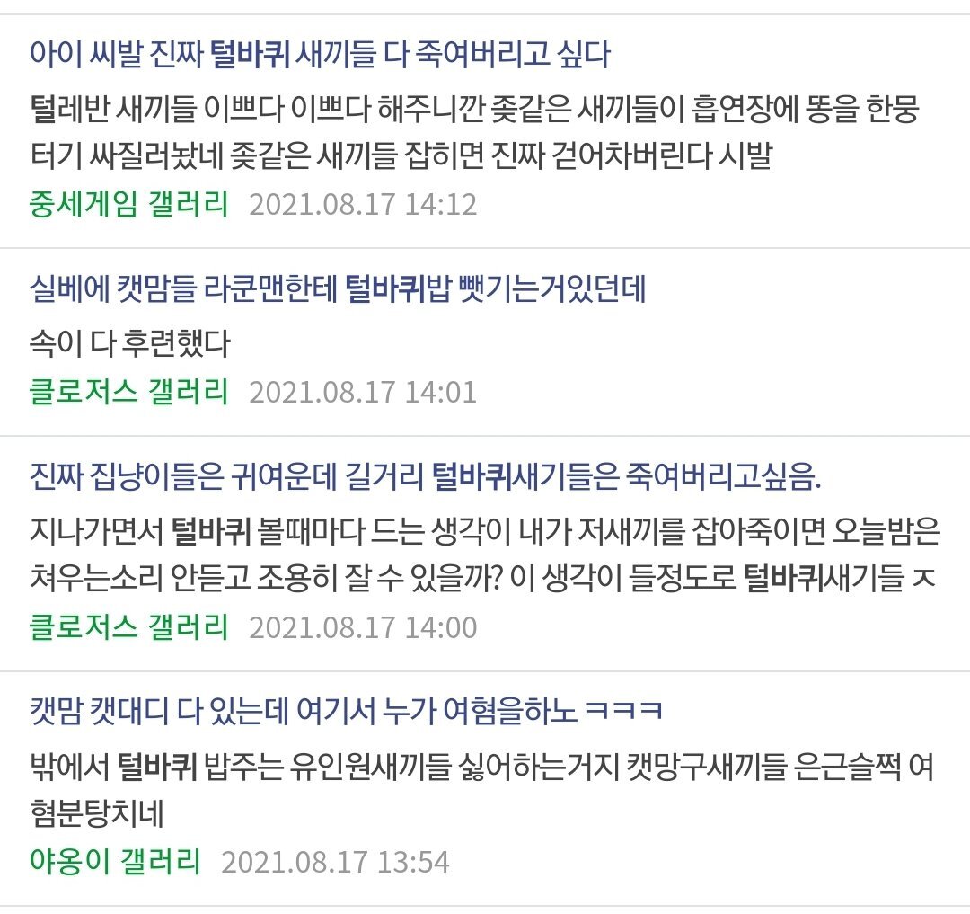 작성자포키초키웅앵웅 작성시간 21.08.24 씨발새끼들 아 다 죽여버리고싶어 진짜 다 그냥 불타죽어버려