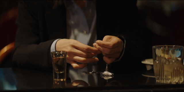 바에서 엉킨 목걸이를 풀고 있으나, 잘 풀리지 않음.