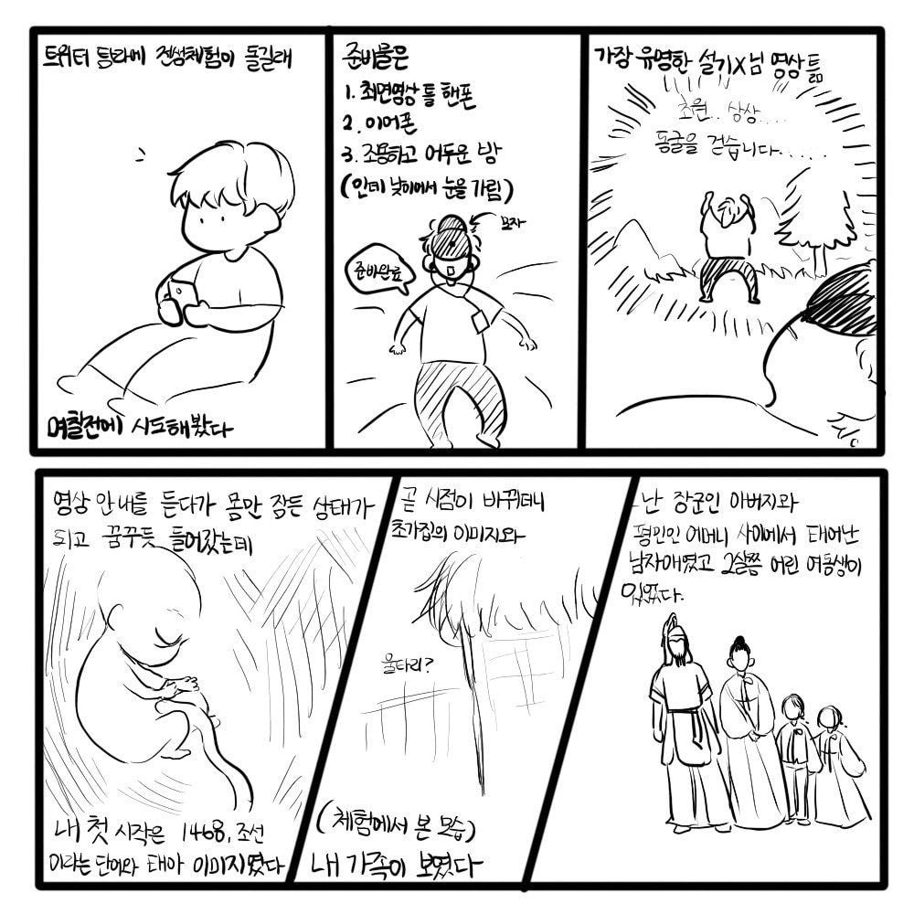 작성자한밤의 무드등 작성시간 21.09.01 전생체험 영상 내 꿀잠비디오야.... 한번도 성공해본적은 없고 잘 자기만 함 항항