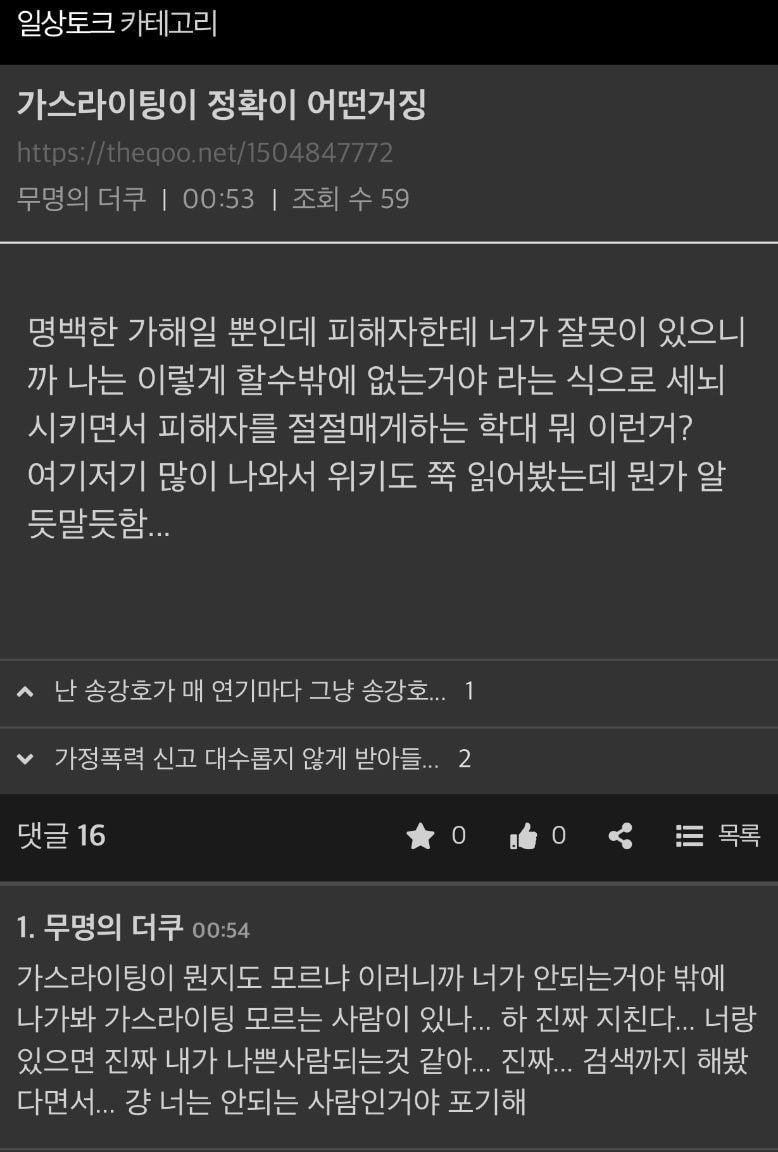 작성자하루종일쉬는여시 작성시간 21.09.05 가스라이팅이 뭔지 검색했는데도 모를정도면.. 너 진짜 문제 있는거야 알고 있어?... 진심 나 아니면 너 어떡하려고 그러냐...