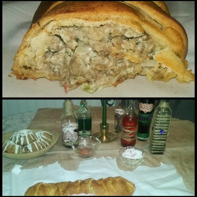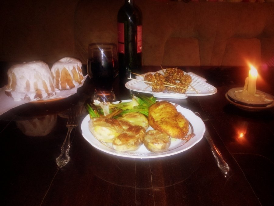 벌꿀 호두과자, 삶은 감자, 구운 파, 스위트롤, 순한 포도주