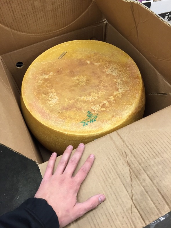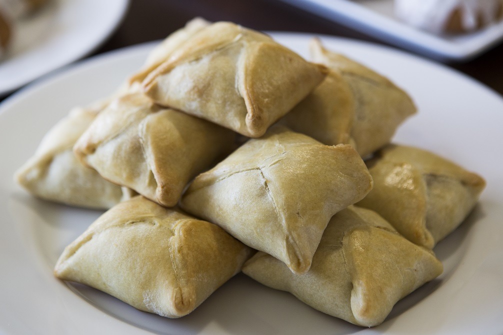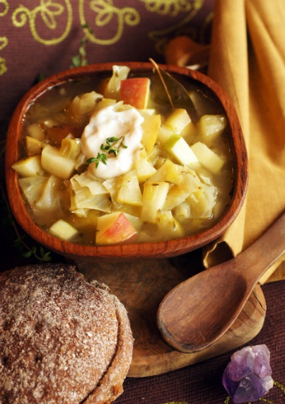 구운 파, 삶은 감자, 닭가슴살 구이, 에이다 치즈 조각, 빵, 스위트롤, 덜 익은 사과, 사과 양배추 스튜인듯