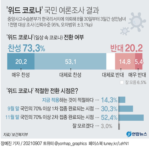 서울=연합뉴스) 송은경 기자 = 국민의 70% 이상이 일상생활이 가능한 정도로 코로나19 유행을 통제하는 '일상 속 코로나'(위드 코로나) 전환에 찬성하며, 그 시기는 2차 접종이 완료되는 11월 말께가 적당하다고 여기는 것으로 나타났다.