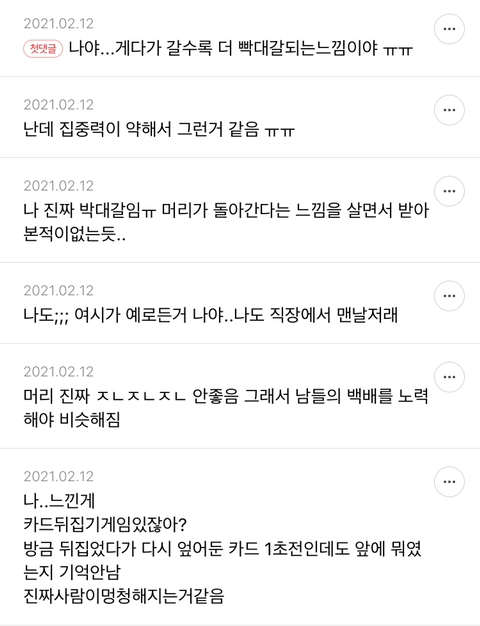 작성자홍삼스틱맛아몬드 작성시간 21.09.09 근데 있잖아? 나는 어릴때부터 카드뒤집기 존나 잘하고 늘 영재라는 말 들었거든? 회사에서도 에이스였고 늘 잘했음. 나잘난맛에 살고있었는데 전공은 디자인이야. 아주 크리에이티브했지. 근데 지금 직업을 바꿨는데 딱 본문같아. 상대방이 뭔소리하는지 일을 받으면 뭐부터 해야할지 하나도 모르겠어서 자포자기한 상태. 내가 잘 맞는 일을 먼저 하지 않았다면 난 태생이 멍청한줄 알고 살았을거야. 지금 회사에서 일하는 똑똑한 사람들, 안맞는 일 하면 못할걸? 여기 댓글단 사람들도 맞는 일을 못찾아서그래. 사람 재능은 캐릭터 스탯처럼 기억력에 이해력에 체력에 순발력에 창의력에 등등 나눠져있으니까 본인이 멍청하다고 생각하지마. 그냥 잘 맞는 일을 못찾은것 뿐이야. 찾을때까지 계속 도전해!!!