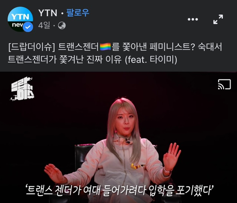 [스크랩] [흥미돋]래퍼 타이미 시켜서 "트랜스젠더를 숙대에서 쫓아낸 페미니스트", '터프'라고 하면서 악마화하는 YTN