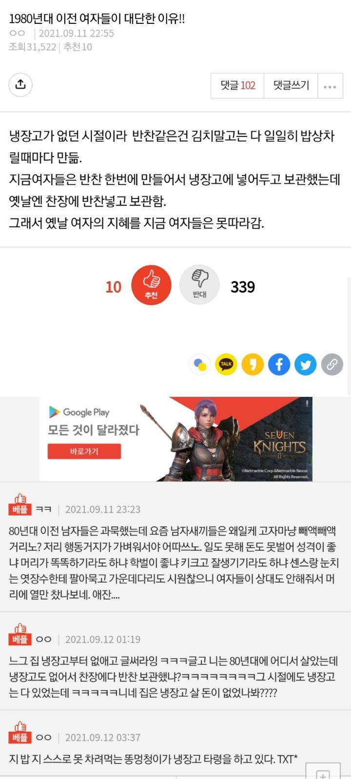 [기타]1980년대 이전 여자들이 대단한 이유!! 작성자내맘대로하고픈거하자|작성시간21.09.13|조회수7,588 목록 댓글 13 글자크기 작게가 글자크기 크게가 출처 : https://m.pann.nate.com/talk/362425209?currMenu=talker&order=DIS&page=1 다음검색 현재 게시글 추가 기능 열기 북마크 공유하기 신고 센터로 신고 댓글 댓글 13 댓글쓰기 답글쓰기 댓글 리스트 작성자긴가민가하는 | 작성시간 21.09.13 90년대생은 초등학교때 막노동을 하고 80년대생은 석빙고세대였다니.... 작성자노인헌터 | 작성시간 21.09.13 80년대 남자들은 군대3년씩가고 집도해왔는데 !!!ㅡㅡ 작성자다음주에사표쓴다 | 작성시간 21.09.13 댓글 쌉공감 작성자아니오레오 | 작성시간 21.09.13 1880년이면 그럴 수 있지 작성자외또우시나요 | 작성시간 21.09.13 개털리고 글삭했네 ㅉㅉ 댓글 전체보기