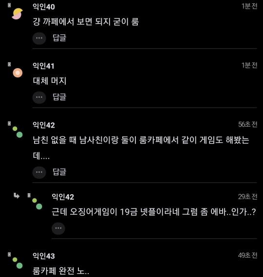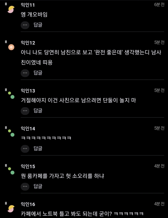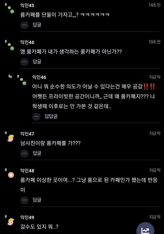 작성자skslwl 작성시간 21.09.19 와진짜?나친구랑 룸카페가서 자주 수다떨러가는디띠용ㅋㅋㅋㅋㅋㅋㅋ