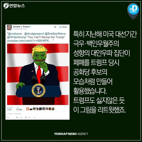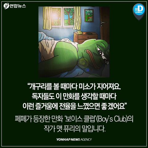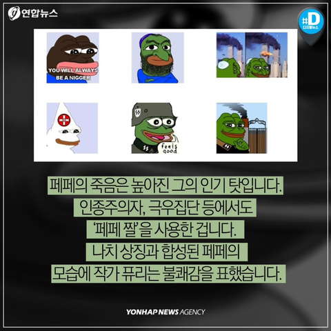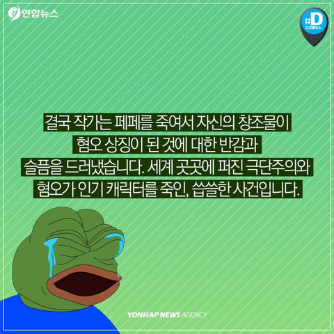 작성자까오나시 작성시간 21.09.23 나도 페페 다큐 왓챠에서 봤는데 저 작가 페페랑 닮았음.. 어릴때부터 쭉 그려오던 애착갖고있는 캐릭터가 저딴식으로 혐오의 상징이 된다는거 끔찍해..