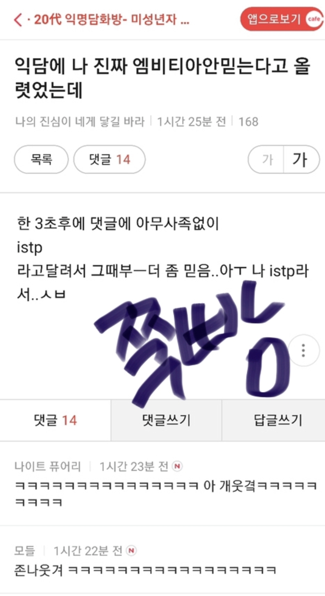[기타]나 진짜 mbti 안믿는다고 글 올렸었는데 작성자일하기싫은 여시|작성시간21.09.24|조회수21,109 목록 댓글 74 글자크기 작게가 글자크기 크게가 출처 : 여성시대 일하기싫은 여시 다음검색 현재 게시글 추가 기능 열기 북마크 공유하기 신고 센터로 신고 댓글 댓글 74 댓글쓰기 답글쓰기 댓글 리스트 작성자천국의문을연다.. | 작성시간 21.09.24 ㅆㅂㅋㅋㅋ 작성자호로로롴 | 작성시간 21.09.24 남에꺼맞추는사람 엠비피도궁금하다 얼마나관심있으면 다외워ㅋㅋ 답댓글 작성자아현동익살보살 | 작성시간 21.09.24 내주변은 infp 친구들이 잘맞추더라 ㅋㅋㅋ관심도 많고! 답댓글 작성자달포어 | 작성시간 21.09.24 나도 맞추는거 희열느껴 intp 작성자잇팁여시 | 작성시간 21.09.24 나 존나 조아하는데.. 댓글 전체보기