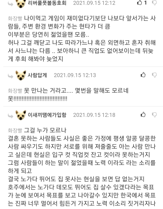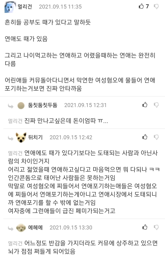 어린애들 커뮤에서 막연한 여혐에 찌들지 말고 연애해라 안타깝다