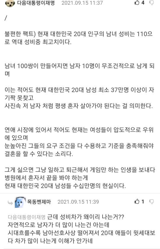 남녀성비 110이라 여자가 우위임 37만명은 도태됨