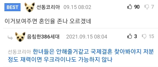 작성자호요 작성시간 21.09.27 여자들이 결혼하겠다고 동남아 남자 돈주고 사오는거 본적 있냐고 ㅋㅋㅋ 아직도 즈그들이 우위인줄 알어 ㅋㅋㅋ 미개한 y염색체들 ㅉㅉ
