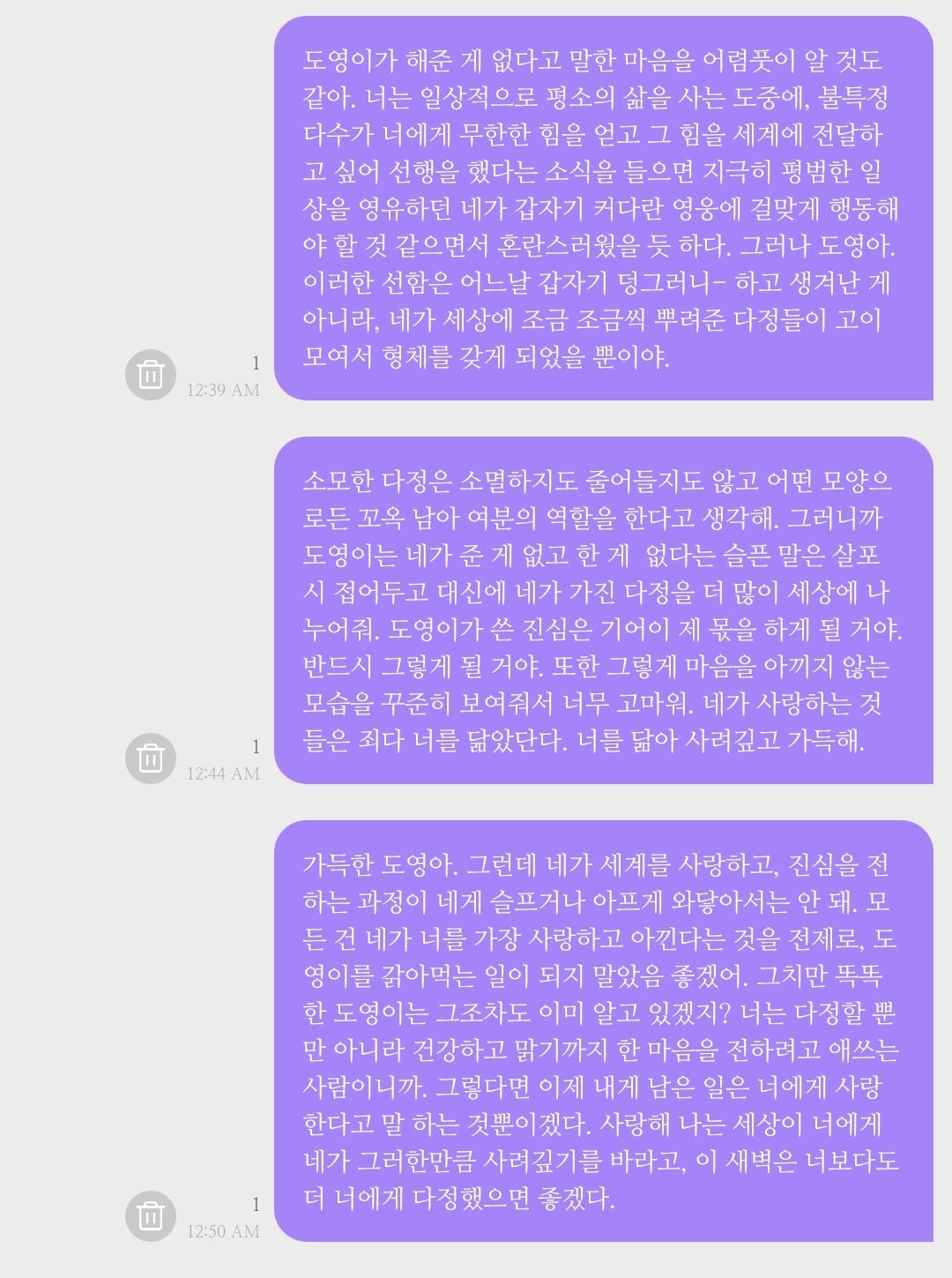 “도영이가 쓴 진심은 기어이 제 몫을 하게 될거야. 그렇게 마음을 아끼지 않는 모습을 보여줘서 고마워. 네가 사랑하는 것들은 죄다 너를 닮았어. 너를 닮아서 사려 깊고 가득해”