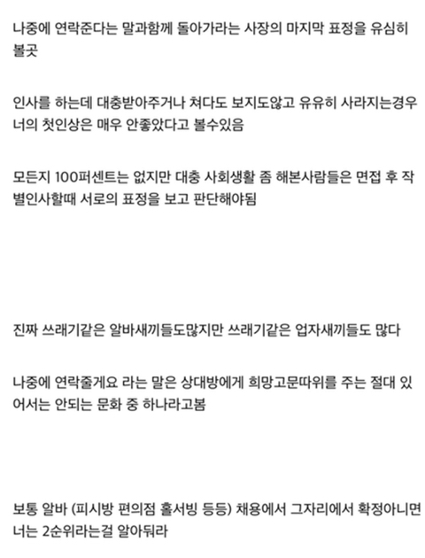 작성자미래를걷는소녀 작성시간 21.10.06 1~4 불합 확신할만큼의 멘트는 아닌거같은데 1이랑 4는 진짜 상관없는듯 근데 오히려 합격기준 4는 거의 모든매장에서 들었는데 떨어진적 많았음ㅎ