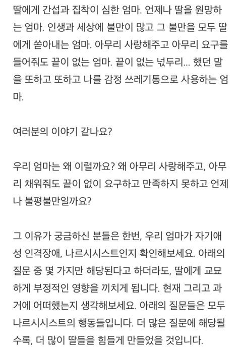 예) 딸의 젊음, 외모, 삶 (대학생활, 직장생활, 해외여행 등)에 대해 질투를 함.