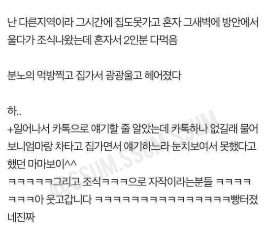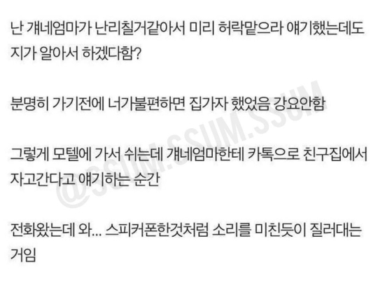 작성자록시땅로즈 작성시간 21.10.08 나도 예전에 디지게 싸운적있음..자기엄마가 자기 고생해서 키우고 웅앵웅 존나 빡쳐서 부모님 고생배틀함