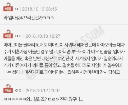 작성자혼자서도 잘 지내는 여시 작성시간 21.10.08 마마보이 이혼가정 개공감ㅎ.. 나도 마마보이 만나봤는데 남편이 없으니까 아들한테 집착 엄청 하더라고.. 데이트하러 나가는 것도 허락맡아야 하고 나랑 데이트할 때 집에 혼자 있을 엄마 생각나서 마음아프다 웅앵 그지랄함